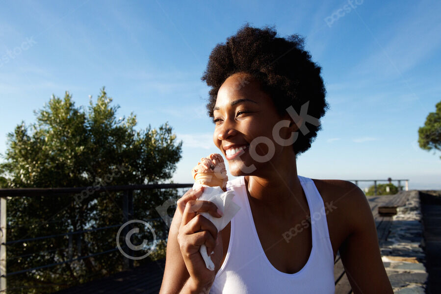 Smiling Black woman holding ice cream looking away standing on street on sunny day
