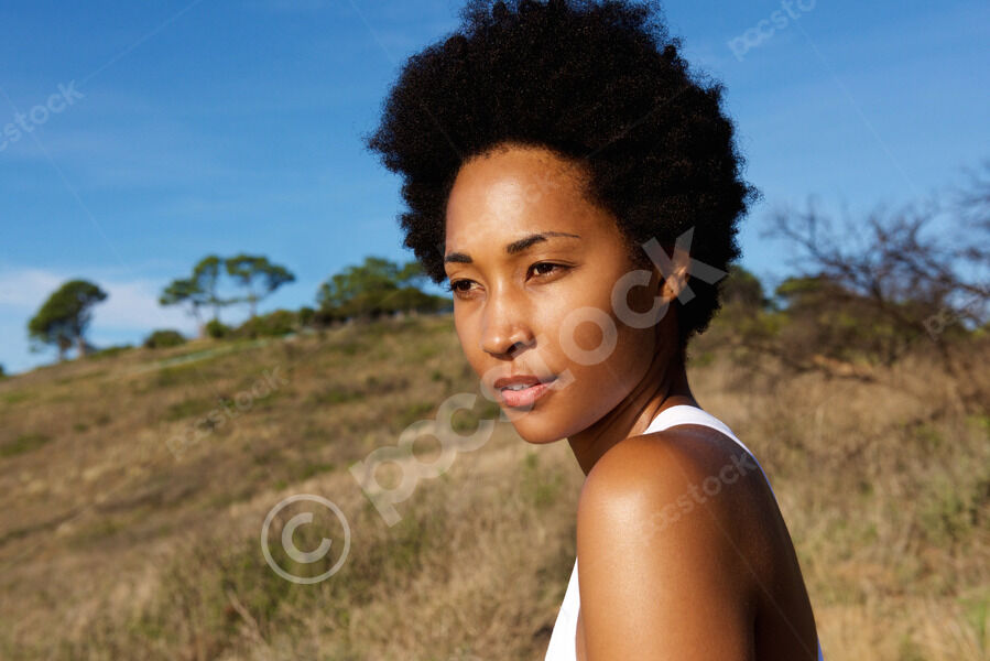 Smiling Black woman with afro hairstyle looking away standing in park on sunny day