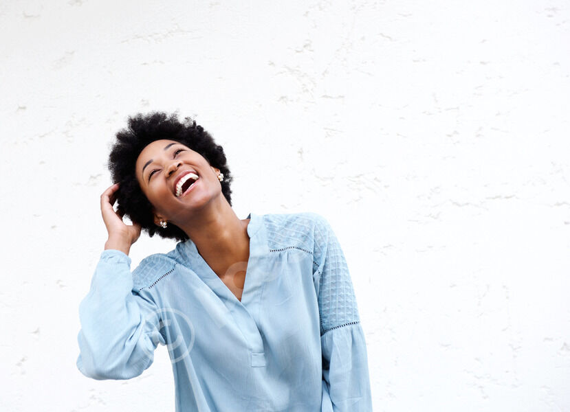 Cheerful Black woman laughing with closed eyes looking up standing against white wall