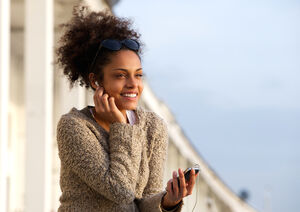 Smiling African American woman holding smartphone listening to music with earphones sitting on bench near building