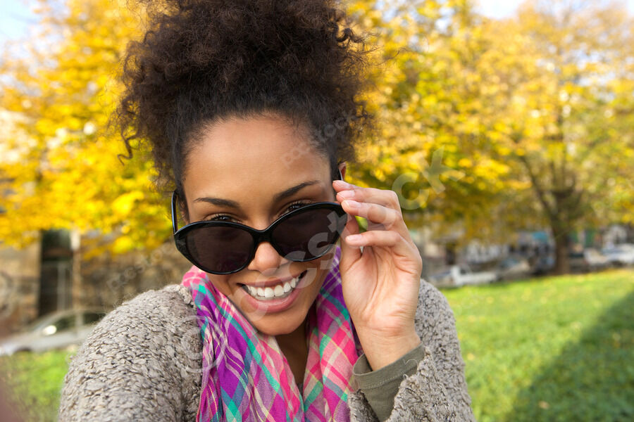 Smiling African American woman touching sunglasses taking selfie standing in park during daytime