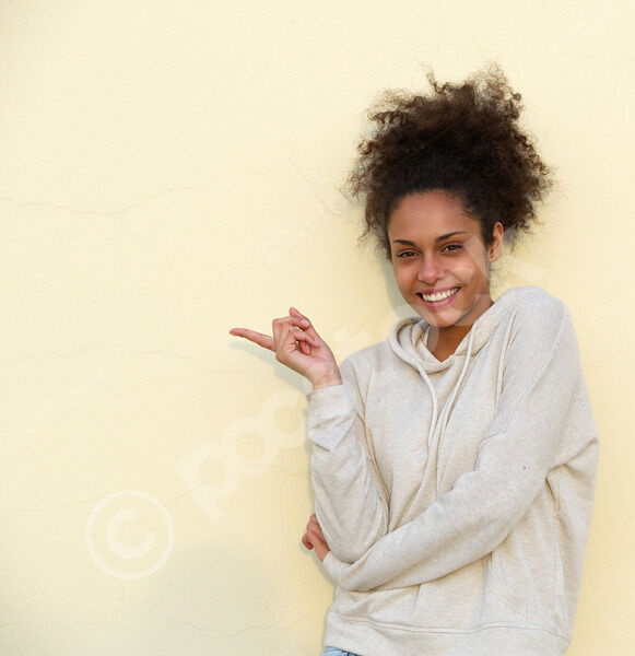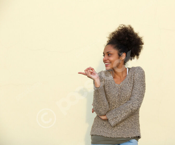 Smiling African American woman leaning elbow on hand pointing sideways standing against yellow background