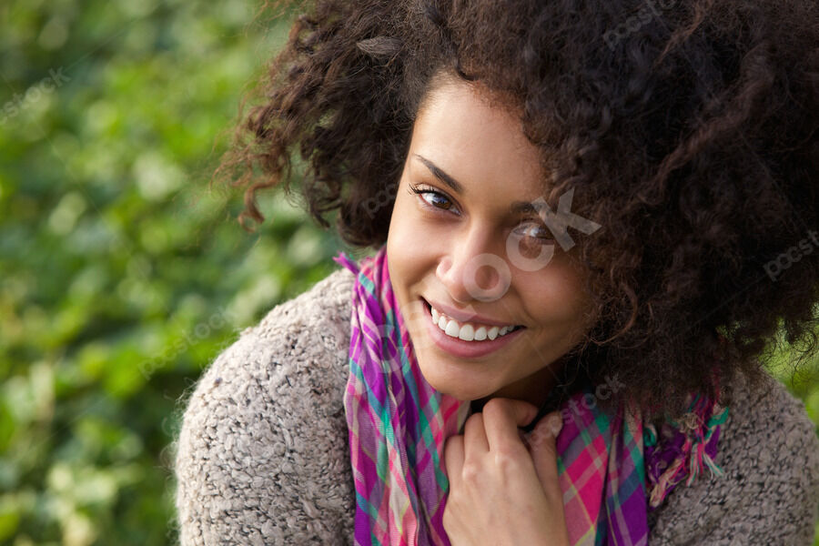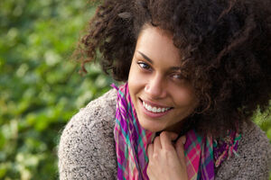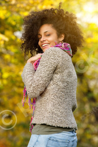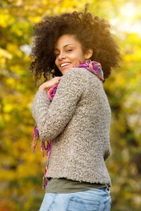 Smiling African American woman with afro hairstyle holding scarf on neck standing sideways near trees in park during daytime