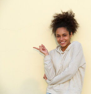 Smiling African American woman with afro hairstyle leaning forward against yellow background