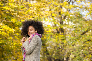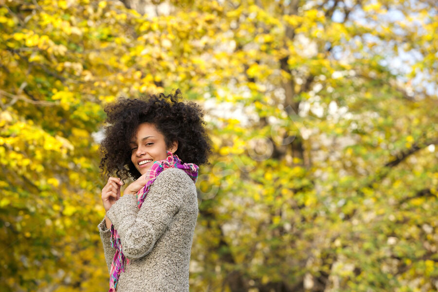Smiling African American woman with afro hairstyle holding scarf on neck standing sideways near trees in park during daytime