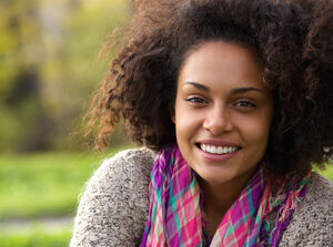 Smiling African American woman with afro hairstyle sitting on grass outdoors during daytime