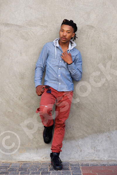 Serious Black man with locks standing with hand and thumb in pockets against gray wall