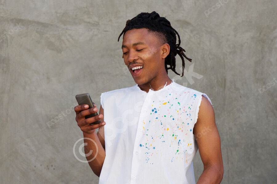 Smiling Black man with locks using smartphone standing against concrete wall on street