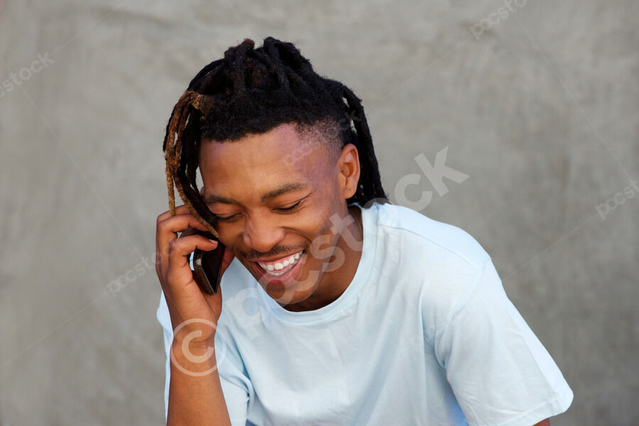 Cheerful Black man with locks laughing with closed eyes having phone call standing against concrete wall