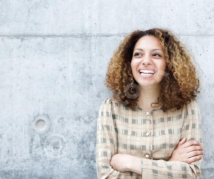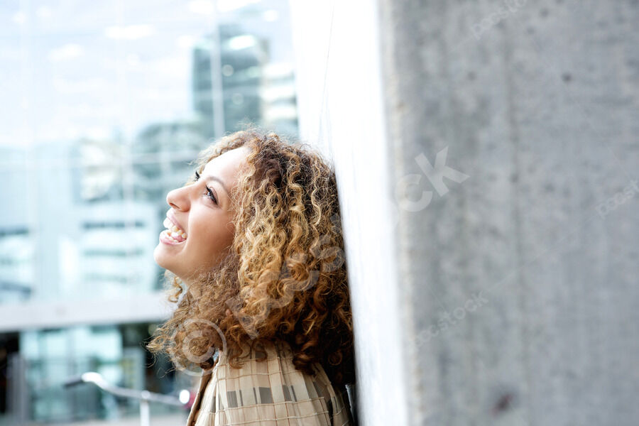 Smiling Black woman looking away standing and leaning against concrete wall on street