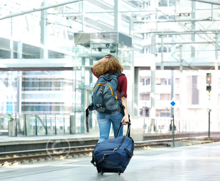 Smiling Black woman standing with backpack and luggage in airport during daytime