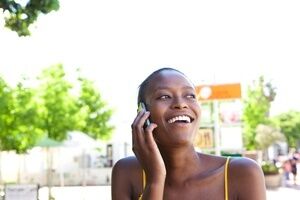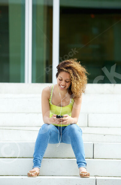 Smiling Black woman in earphones holding smartphone sitting on stairs on street during daytime