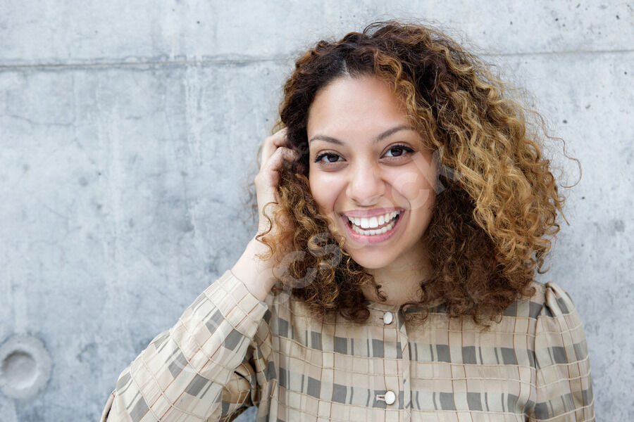 Smiling Black woman looking away standing with hand on hair against concrete wall