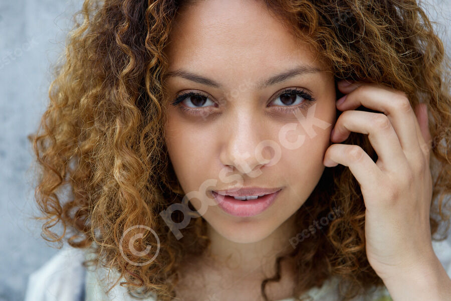 Serious Black woman looking away standing and leaning against concrete wall on street