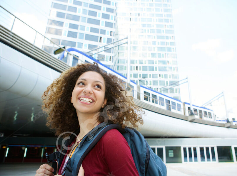 Smiling Black woman with backpack looking down getting off from escalator at train station during daytime