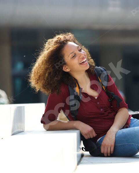 Smiling Black woman with hand on head sitting on floor near backpack in airport during daytime