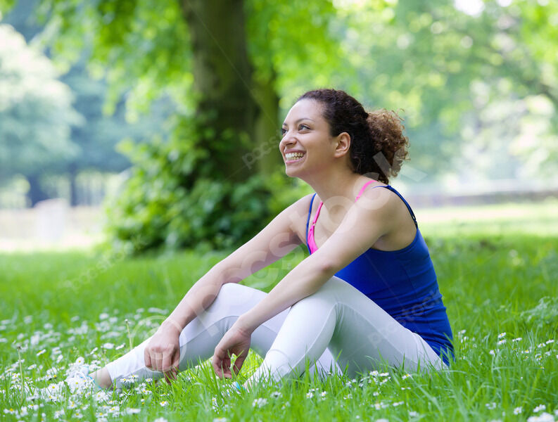 Smiling Black woman looking away sitting on grass in park on sunny day