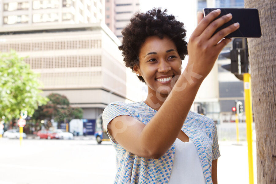 Cheerful Black woman with afro hairstyle showing peace sign while taking selfie in city building during daytime