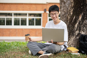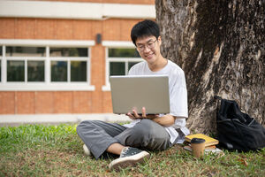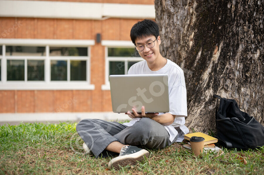 Smiling Asian man working on laptop sitting on grass near tree trunk in park during daytime