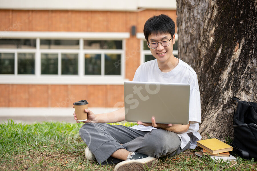 Group of Asian students doing school project together sitting on grass near tree trunk in park during daytime