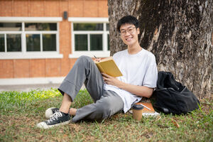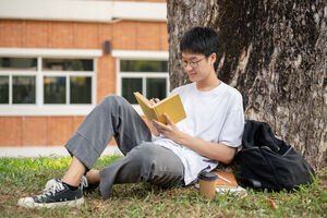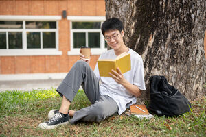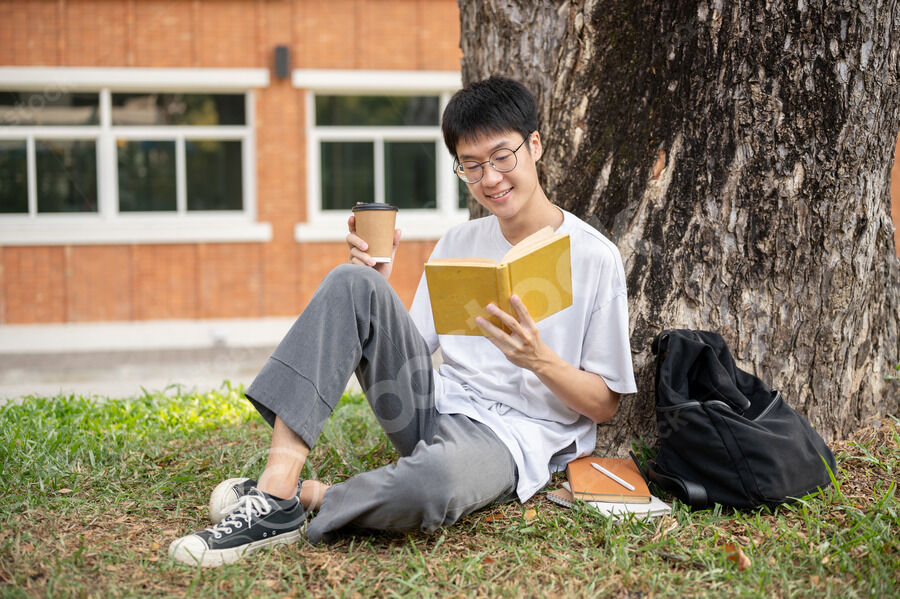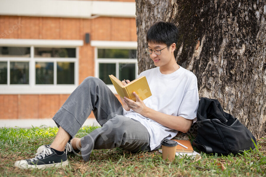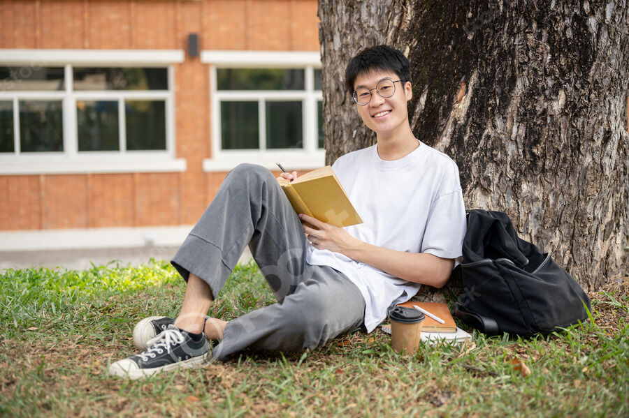Smiling Asian male wearing eyeglasses reading book leaning on tree trunk sitting on grass in park during daytime