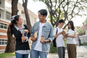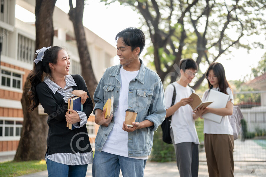 Group of Asian male and female students talking while standing in walkway on campus during daytime