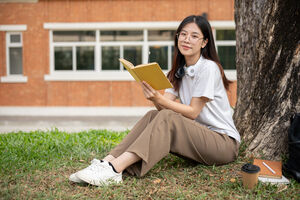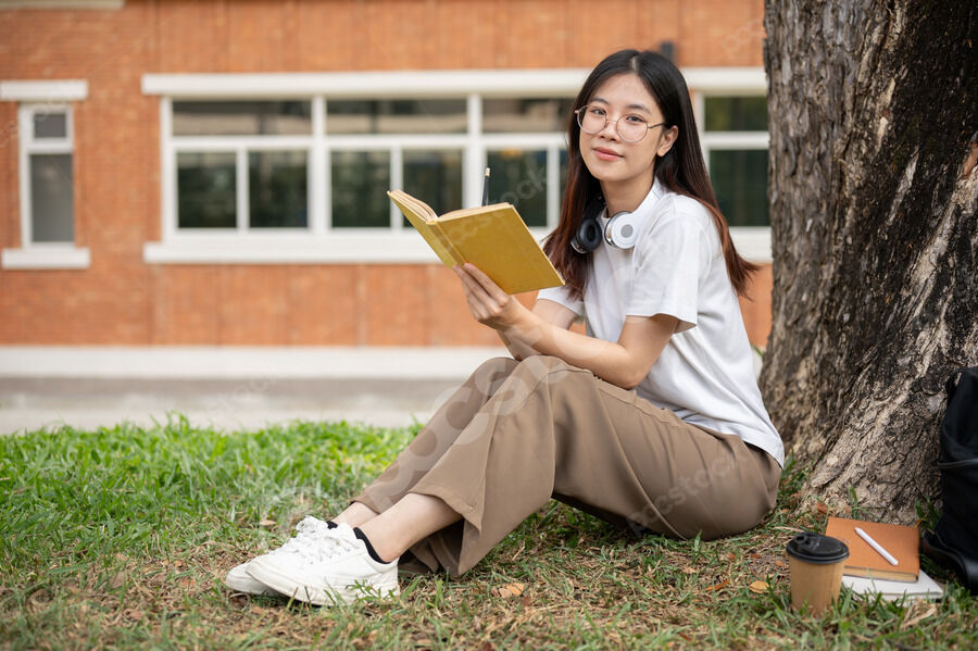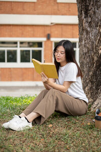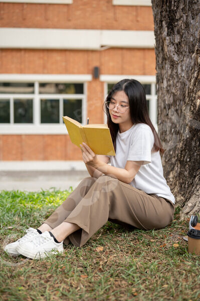Asian female wearing eyeglasses reading book sitting on grass near tree trunk in park during daytime