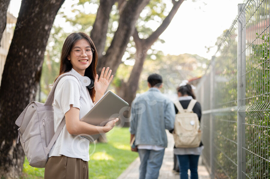 Smiling Asian female wearing eyeglasses waving hand holding book with classmates standing on walkway outside the campus during daytime