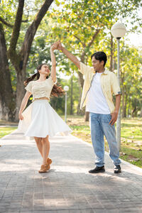 Smiling Asian couple looking at each other while dancing on walkway in park during daytime