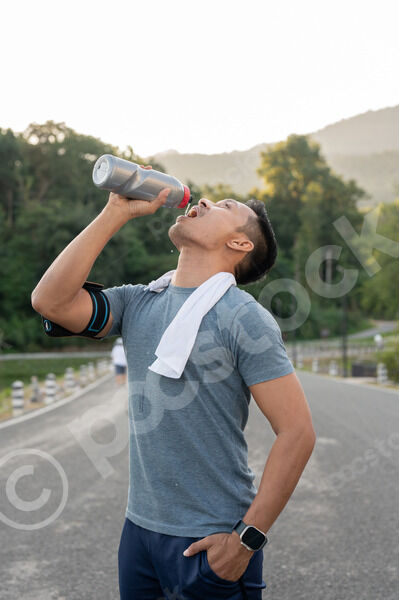 Smiling Asian man in sportswear looking at his watch while running on the road