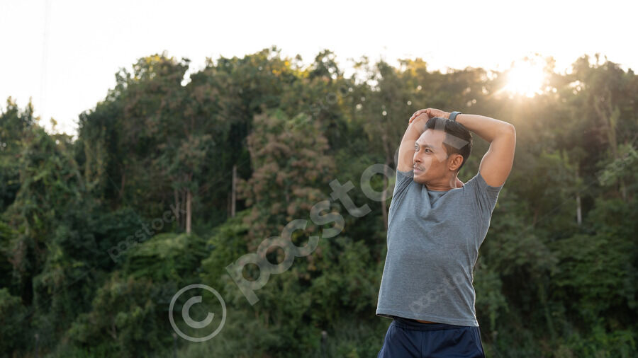 Asian man in sportswear stretching arms and legs while sitting on ground in park
