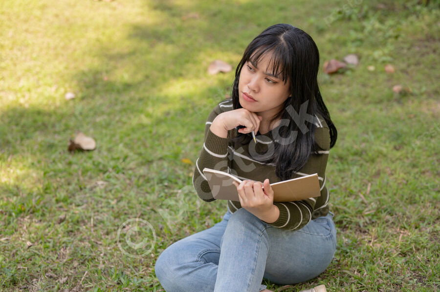 Serious Asian woman wearing casual clothing leaning her head on hand with a pen while looking on her tablet screen sitting in cafe