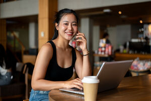 Smiling senior Asian business woman having phone conversation while working on laptop sitting at table in office during daytime