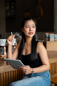 Smiling senior Asian woman holding stylus pen and tablet sitting on sofa at home