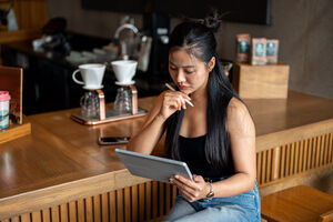 Senior Asian woman holding cup of coffee using stylus pen on tablet while sitting at table with laptop in home office