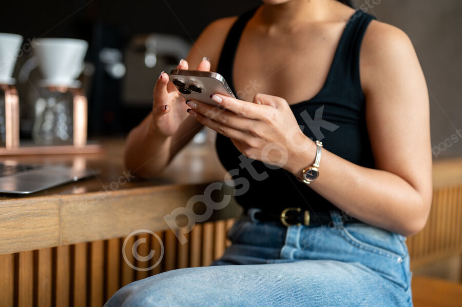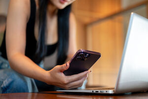 Senior Asian woman using smartphone while sitting at table with laptop in home office