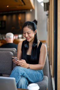 Smiling senior Asian woman using smartphone while sitting on sofa at home