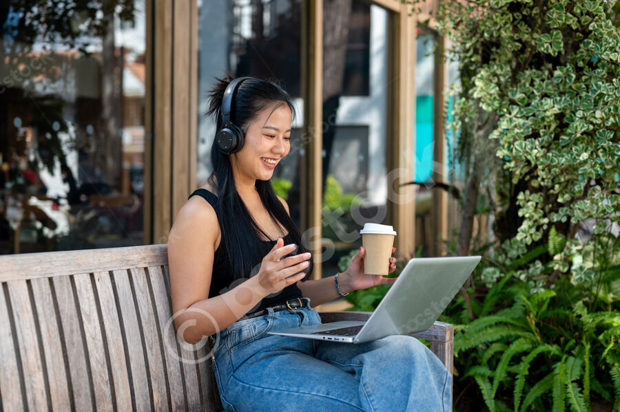 Senior Asian woman holding cup of coffee using laptop while sitting at table in home office