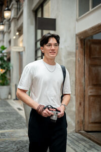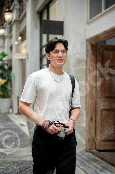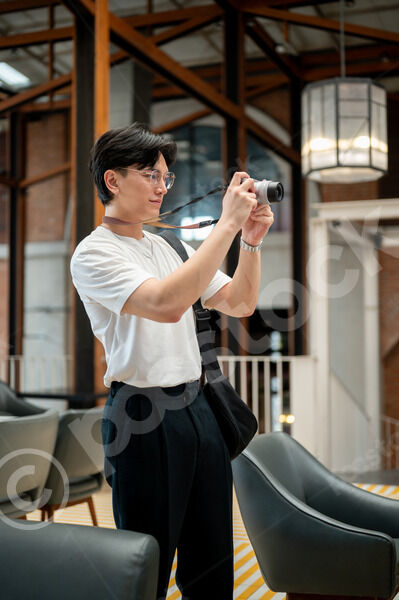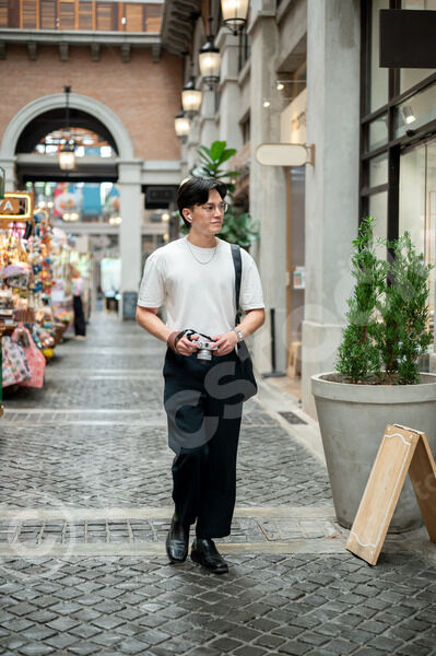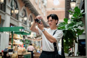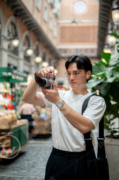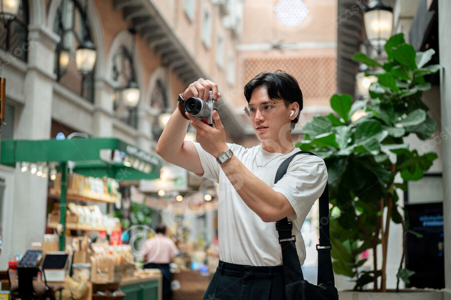 Thai man in white shirt, eyeglasses, and earbuds taking photo using camera while standing in hallway of shopping mall