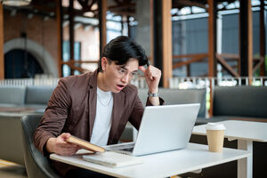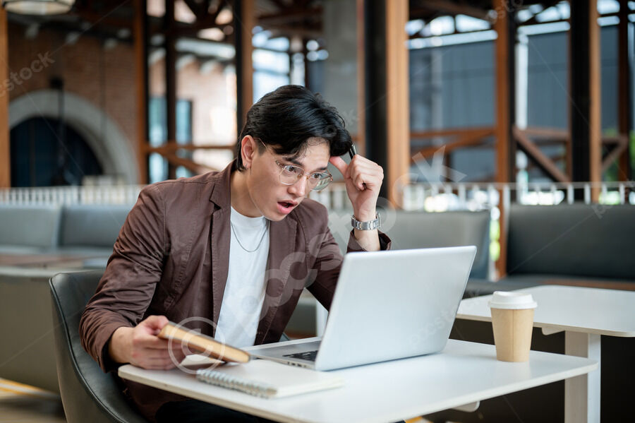 Shocked Thai businessman in brown suit holding book and looking at laptop while sitting at table with notebook and takeaway coffee cup in cafe