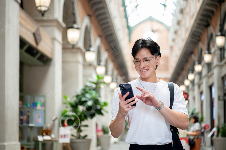 Thai man in white shirt and eyeglasses using smartphone while standing in hallway of shopping mall