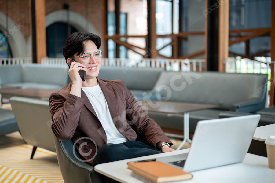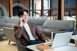 Thai businessman in brown suit and eyeglasses having phone call and looking away while sitting at table with laptop, takeaway coffee cup, and notebooks in cafe