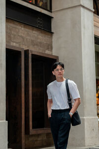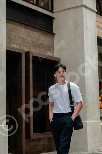 Thai man in white shirt, eyeglasses, and earbuds looking away walking with hands in pockets in shopping mall