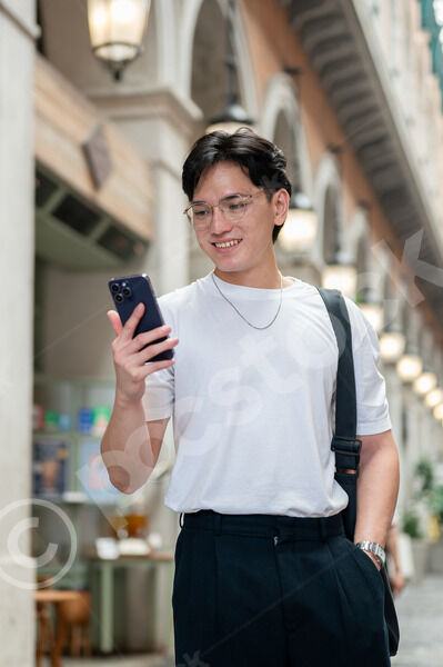 Thai man in white shirt and eyeglasses holding and looking at smartphone while standing with hand in pocket in hallway of shopping mall