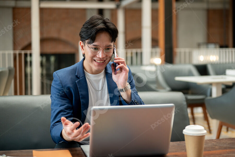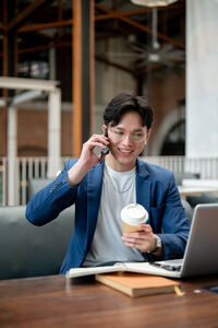 Thai businessman in blue suit and eyeglasses having phone call, holding takeaway coffee cup, and looking at laptop screen while sitting at table with notebooks in cafe
