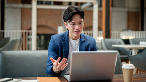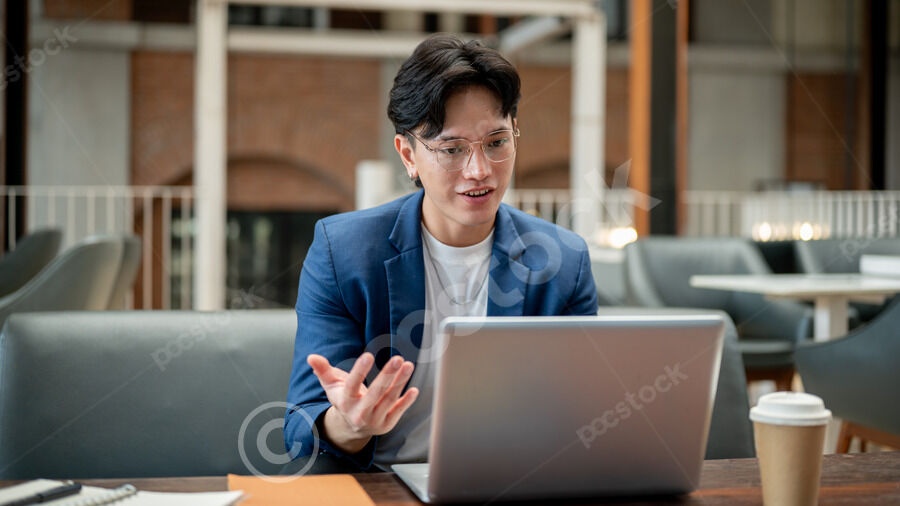 Thai businessman in blue suit and eyeglasses attending online meeting on laptop while sitting at table in cafe