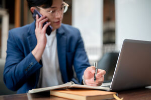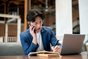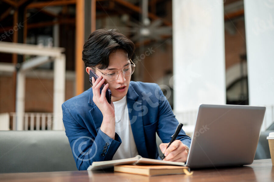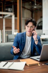 Thai businessman in blue suit having phone call and taking notes while sitting at table with laptop in cafe