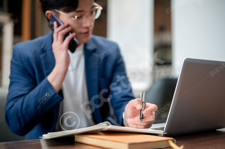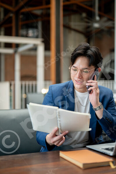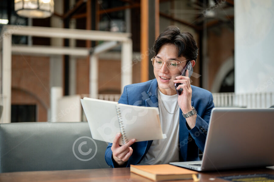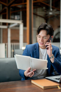 Thai businessman in blue suit having phone call and reading notebook while sitting at table with laptop in cafe