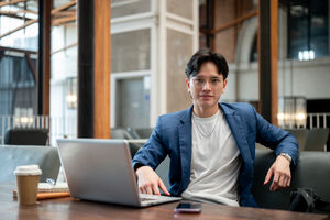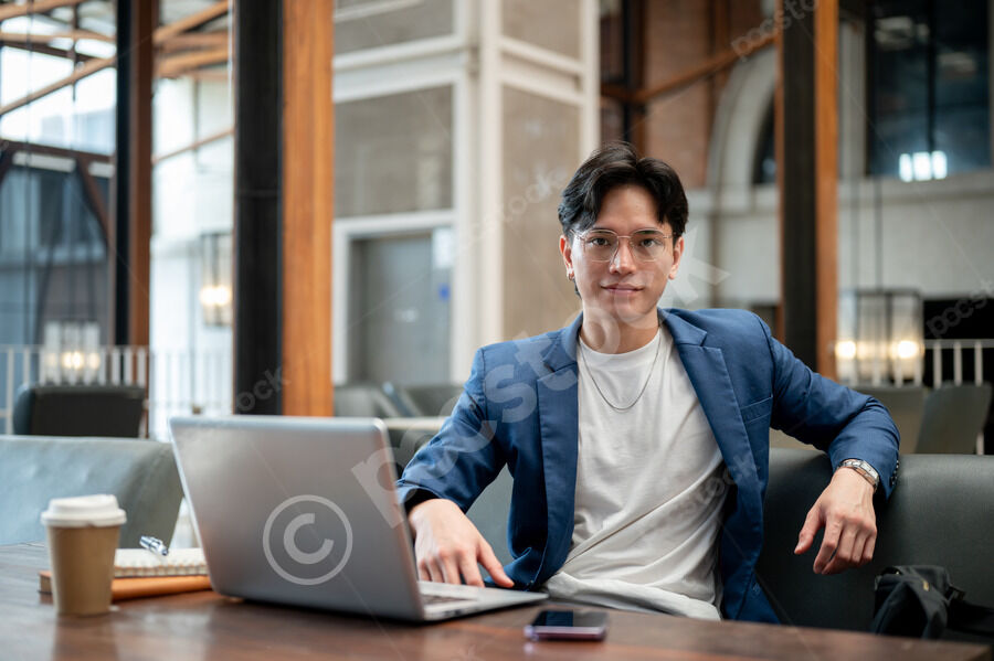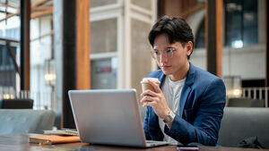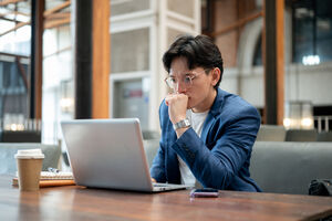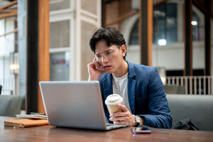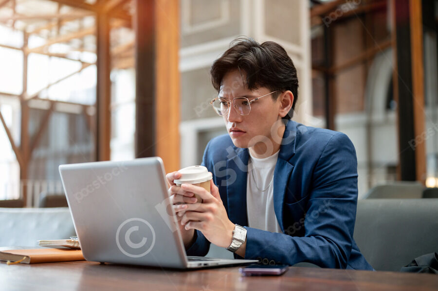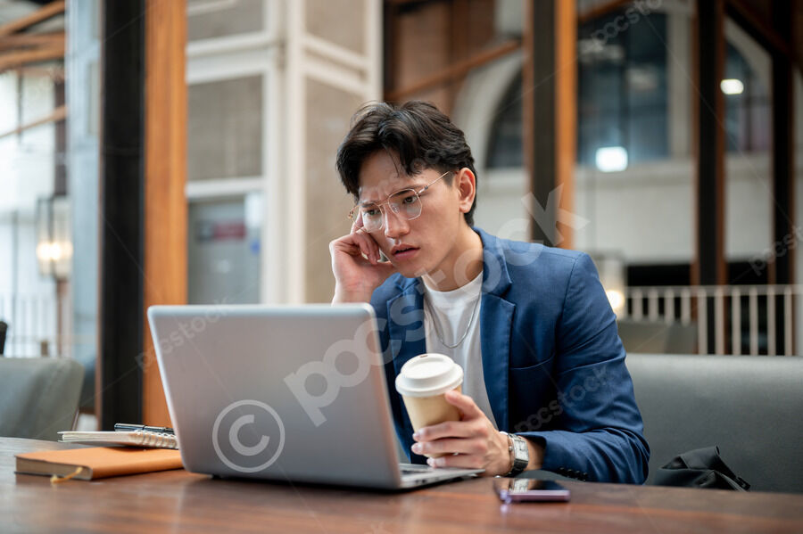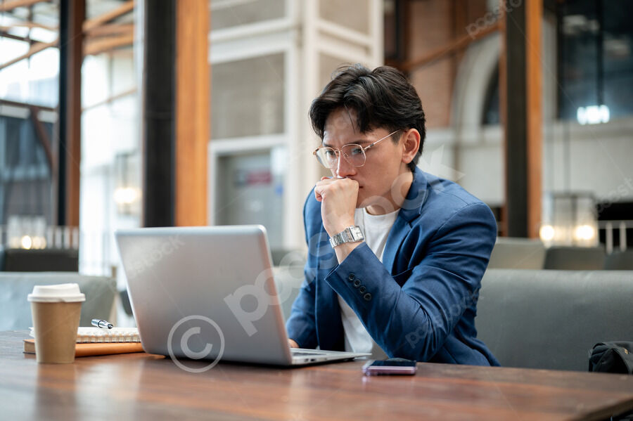 Thai businessman in blue suit and eyeglasses looking intently at his laptop while sitting at table with notebooks, smartphone, and takeaway coffee cup in cafe