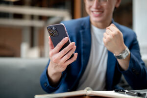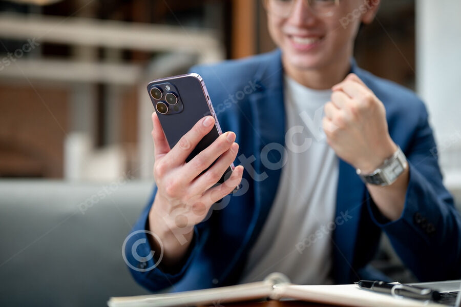 Thai businessman in blue suit and eyeglasses looking at smartphone and raising his fist while sitting at table in cafe